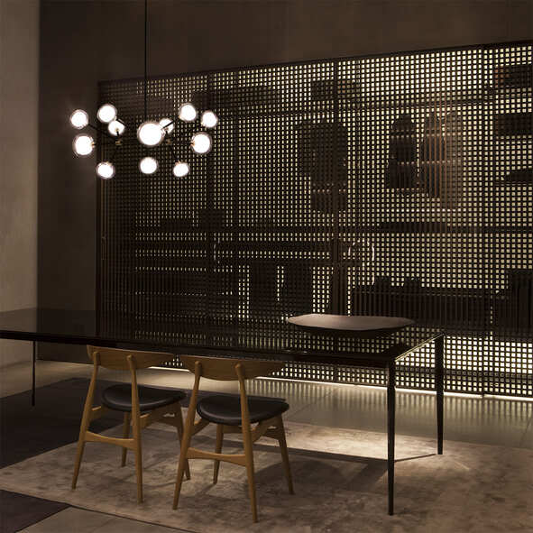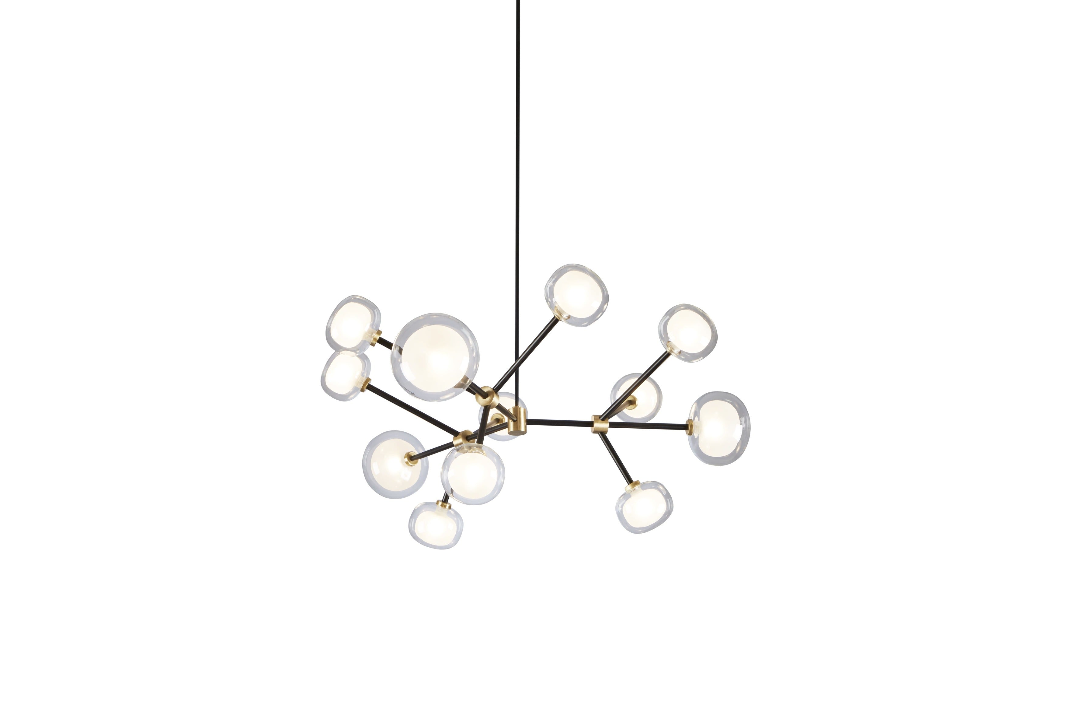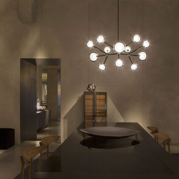 Description: A double-sided spherical bright object in borosilicate glass makes these lamps available in different compositions and a structure made by metal coated with epoxy powder enriched with brushed brass or black chrome details. Richness and sobriety all in one single element.
