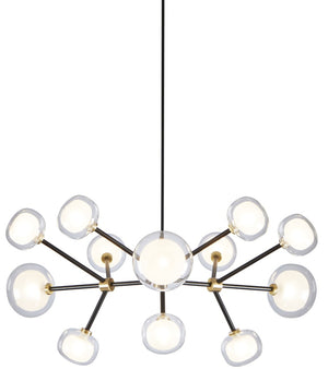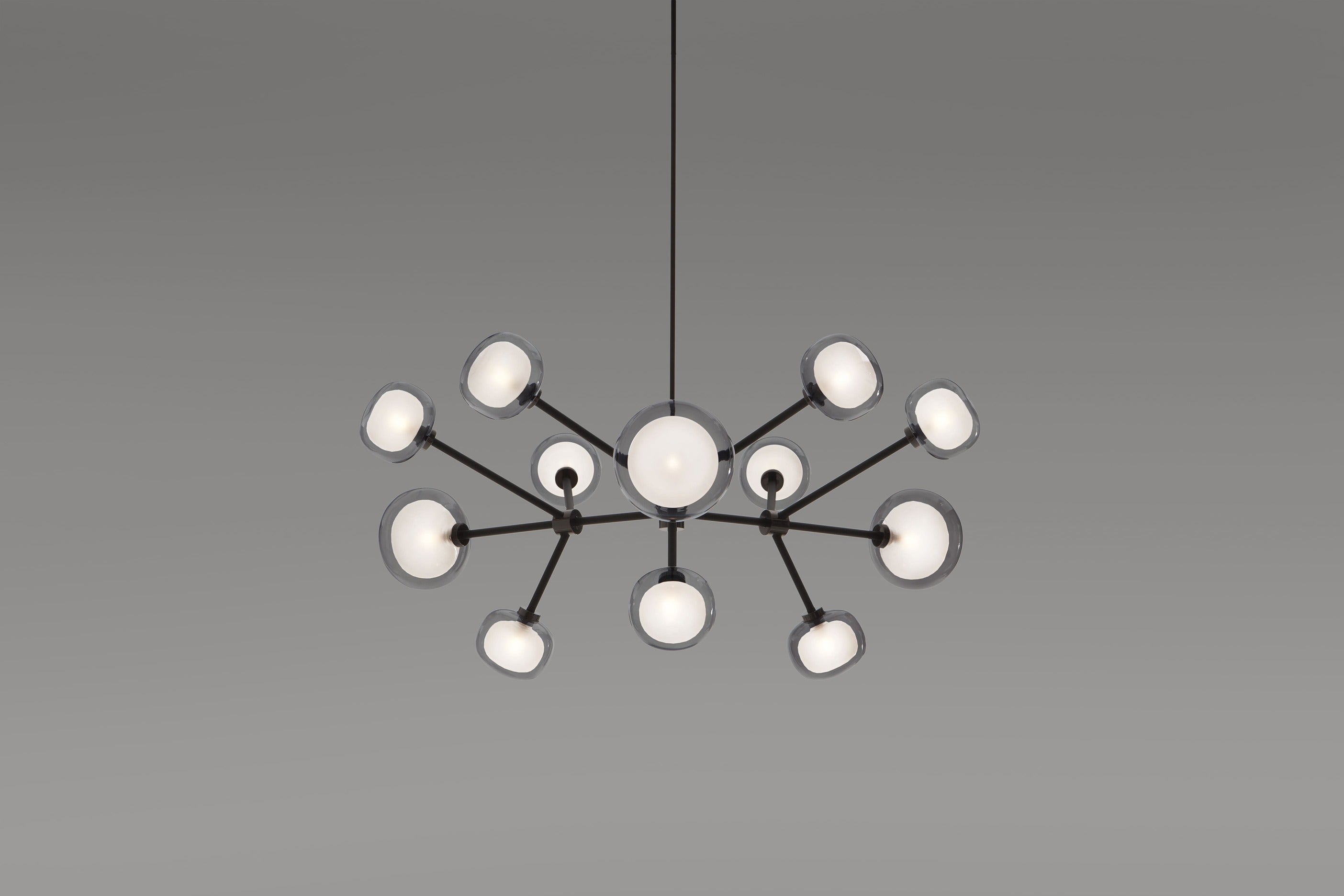 Mounting: Chandelier: 30/60/90 cm stems included (adjusted on site). Canopy: Ø 13 cm included with bracket. Glasses: 9 × Ø 12 cm; 3 × Ø 16 cm. Light source: G9 bulb.