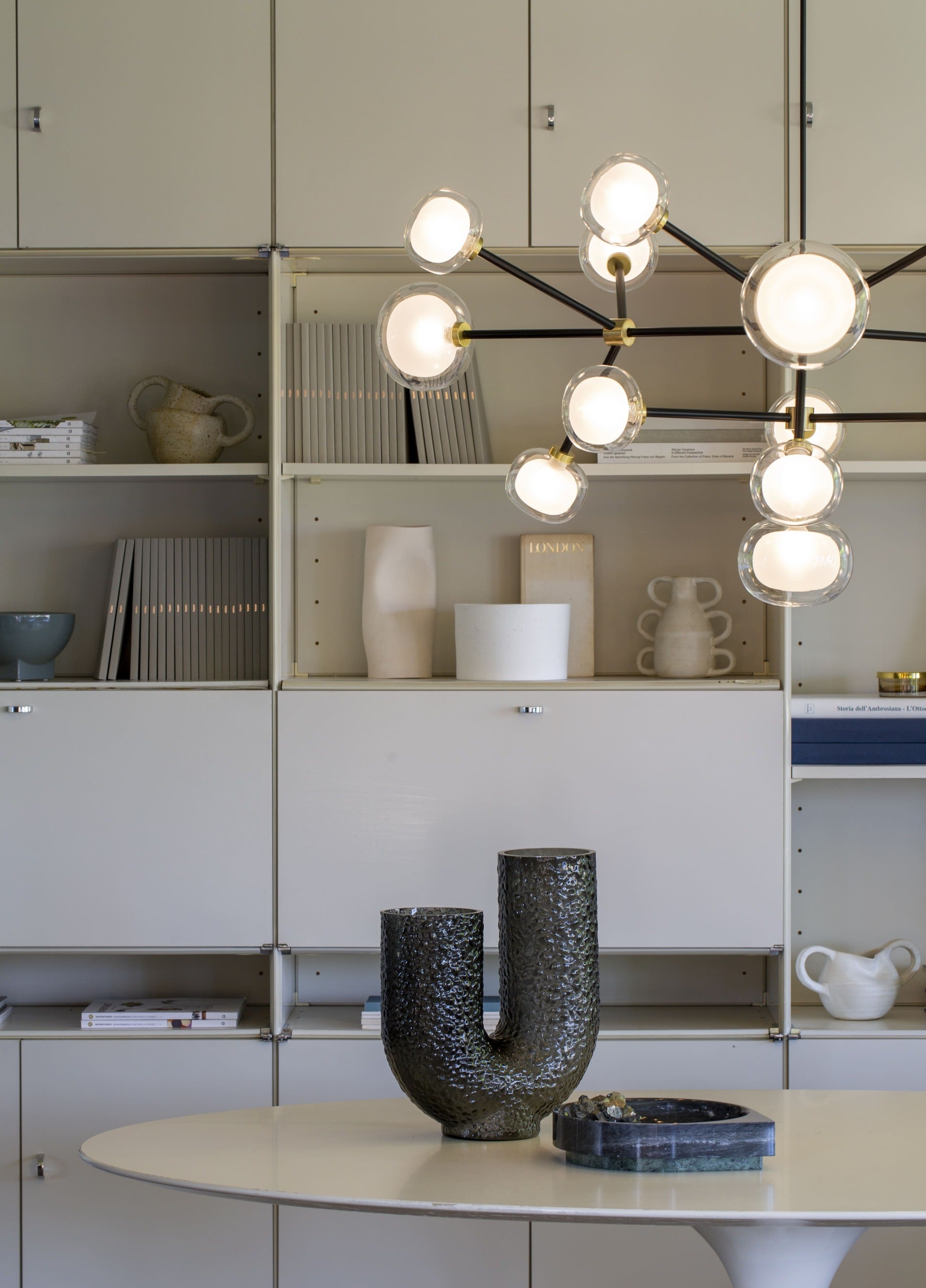 Description: A double-sided spherical bright object in borosilicate glass makes these lamps available in different compositions and a structure made by metal coated with epoxy powder enriched with brushed brass or black chrome details. Richness and sobriety all in one single element.