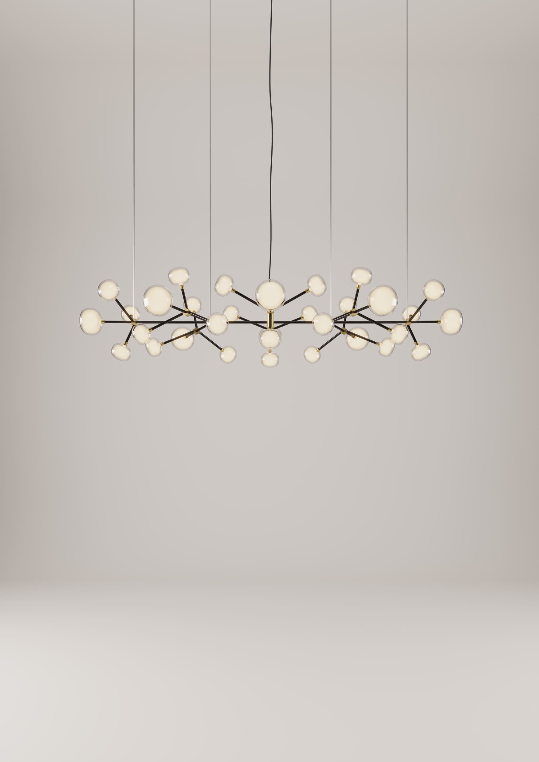 Description: A double-sided spherical bright object in borosilicate glass makes these lamps available in different compositions, supported by a structure of metal coated with epoxy powder and enriched with brushed brass or black chrome details. Richness and sobriety all in one single element.