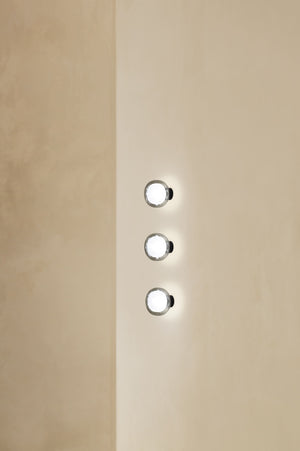 Description: A double-sided spherical bright object in borosilicate glass makes these lamps available in different compositions, supported by a structure of metal coated with epoxy powder and enriched with brushed brass or black chrome details. Richness and sobriety all in one single element.