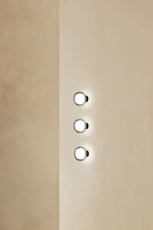 Description: A double-sided spherical bright object in borosilicate glass makes these lamps available in different compositions and a structure made by metal coated with epoxy powder enriched with brushed brass or black chrome details. Richness and sobriety all in one single element.