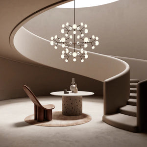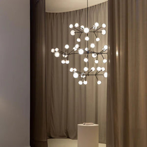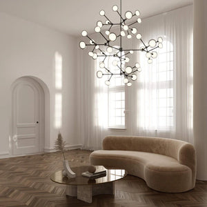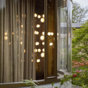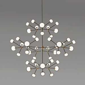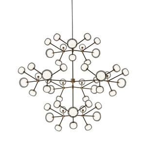 Mounting: Chandelier: custom stem included (adjusted on site). Canopy: Ø 11 cm included with ring hook. Glasses: 36 × Ø 12 cm; 12 × Ø 16 cm. Light source: Integrated LED.