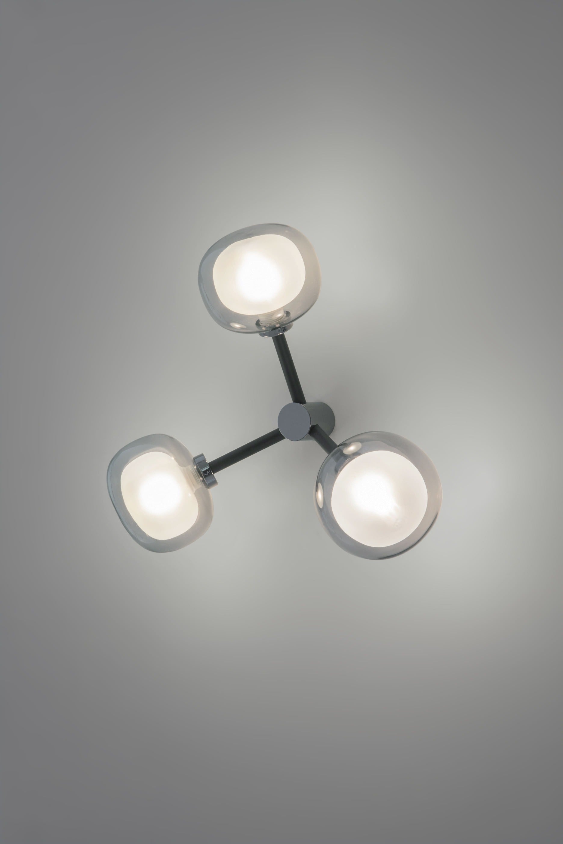 Description: A double-sided spherical bright object in borosilicate glass makes these lamps available in different compositions and a structure made by metal coated with epoxy powder enriched with brushed brass or black chrome details. Richness and sobriety all in one single element.