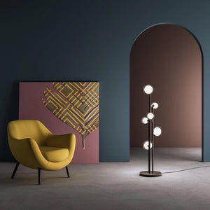 Description: A double-sided spherical bright object in borosilicate glass makes these lamps available in different compositions, supported by a structure of metal coated with epoxy powder and enriched with brushed brass or black chrome details. Richness and sobriety all in one single element.