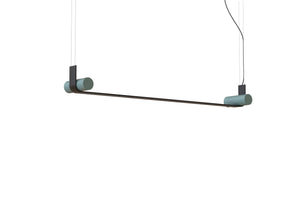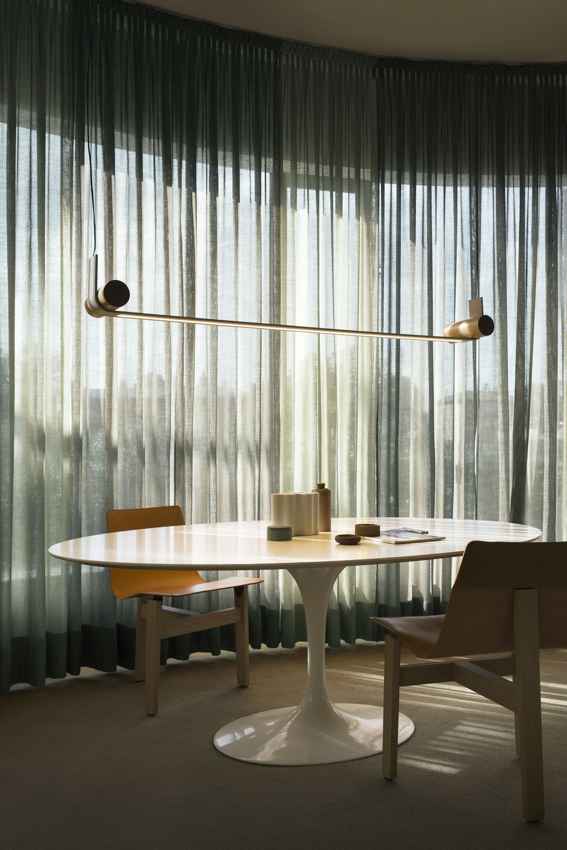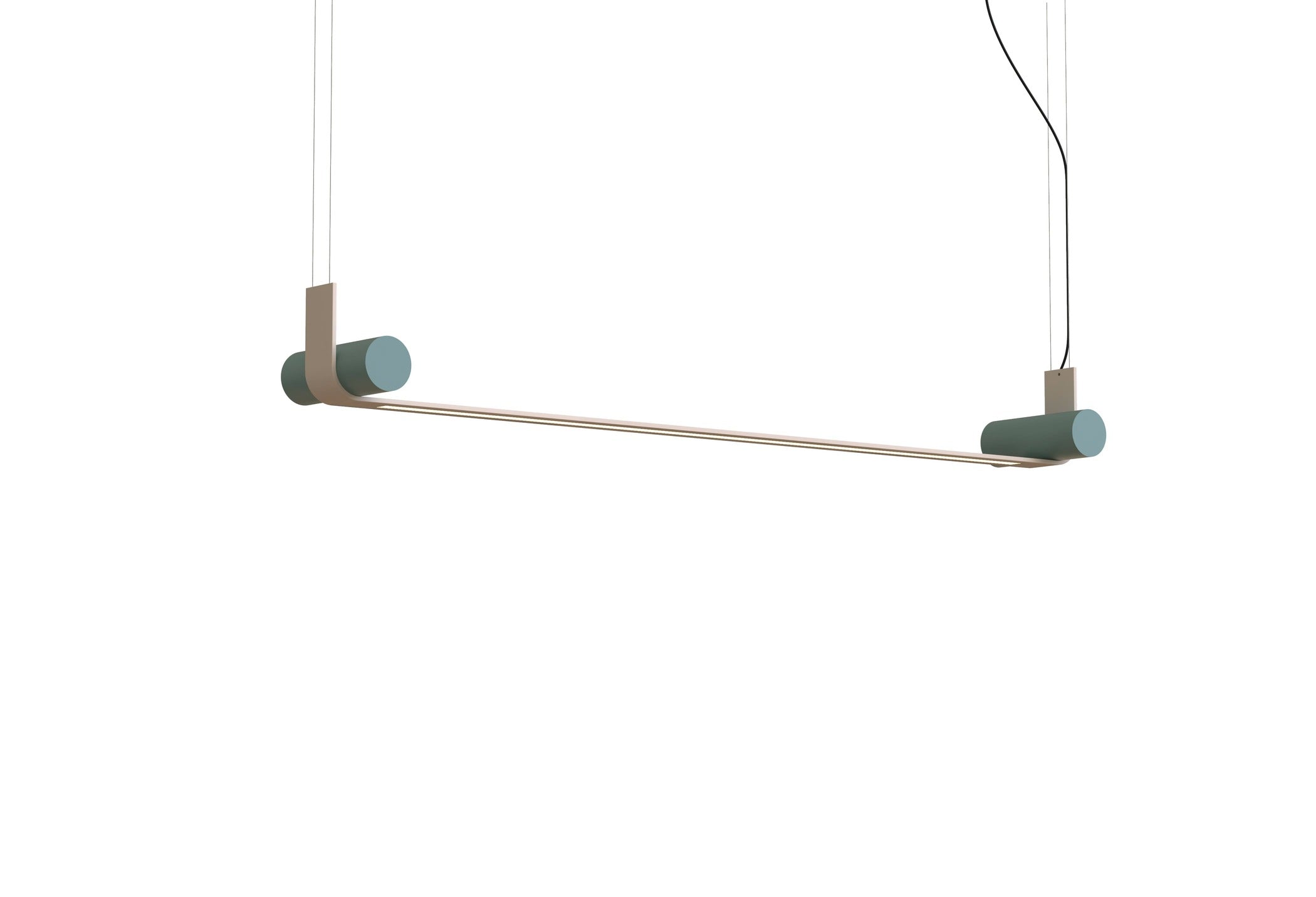 Description: The suspension sees an epoxy powder coated aluminum band structure accompanied by a cylindric weight that counterbalances its flexuosity, in a refined visual balance. The light source consists of a dimmable LED strip; the cylinders are available in epoxy powder coated metal, in wood and in brushed brass.