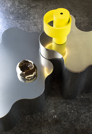 Description: The famous Nastro family composed of pendant, wall, floor and table lamps, designed by Studiopepe, sees two new important interpretations. These interpretations move in the wake of an aesthetic based on the balance of a cylindrical weight in a band structure made of aluminium and painted with epoxy powder. The system therefore includes a new scenography; a suspension characterized by the positioning of the light sources within closed circular bands, and a new table lamp with a double guise: portable or fixed.