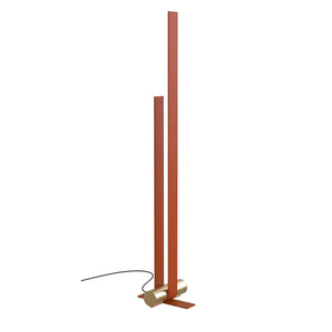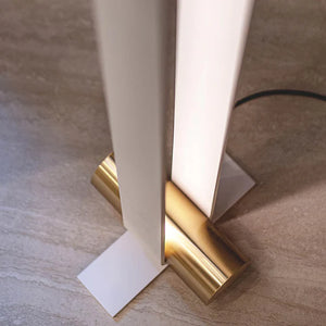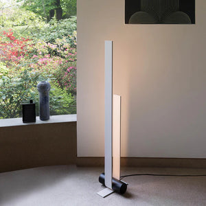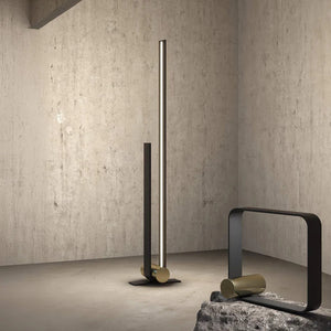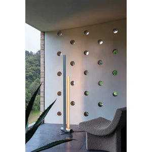 Description: The Nastro floor lamp sees an epoxy powder coated aluminum band structure accompanied by a cylindric weight that counterbalances its flexuosity, in a refined visual balance. The light source consists of a dimmable LED strip; the cylinders are available in epoxy powder coated metal, in wood and in brushed brass.