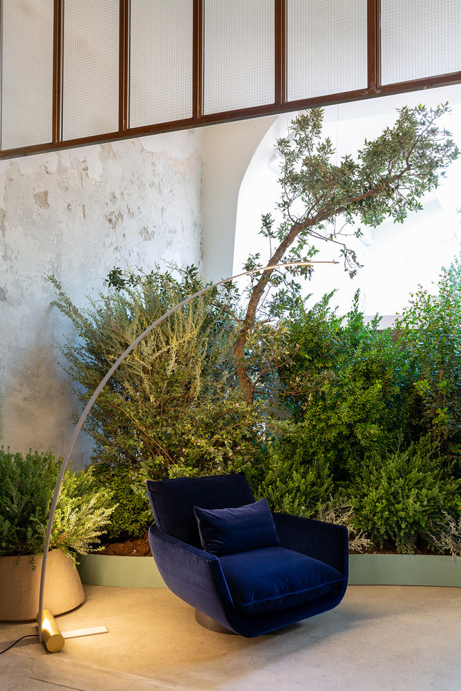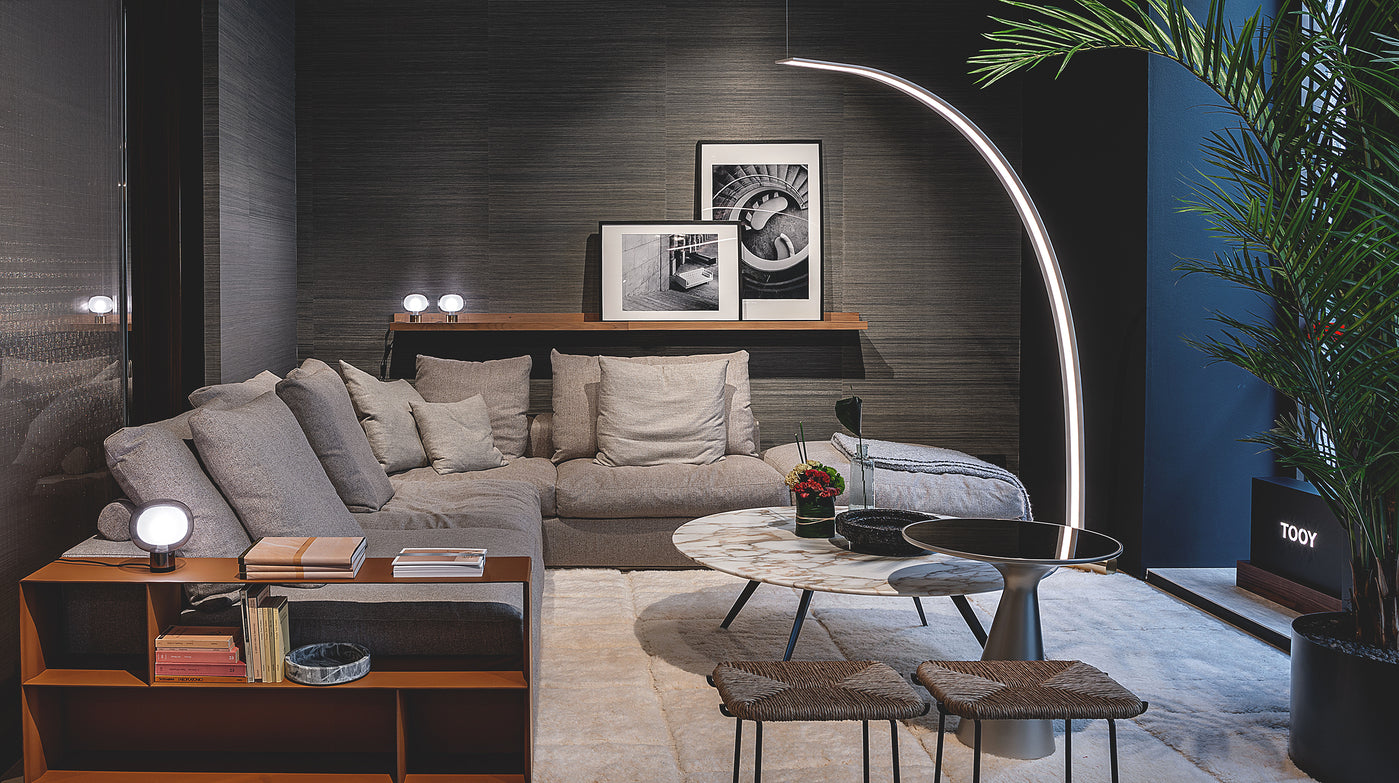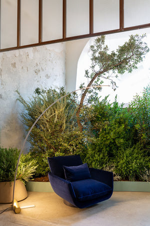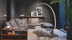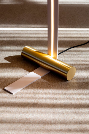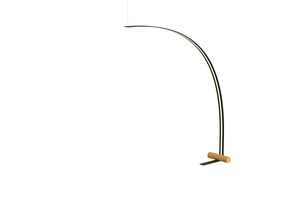 Description: The Nastro floor lamp features an epoxy powder coated aluminum band structure accompanied by a cylindric weight that counterbalances its flexuosity, in a refined visual balance. The light source consists of a dimmable LED strip; the cylinders are available in epoxy powder coated metal, in wood, and in brushed brass.