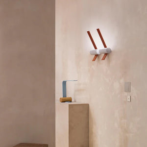 Description: The Nastro wall lamp sees an epoxy powder coated aluminum band structure accompanied by a cylindric weight that counterbalances its flexuosity, in a refined visual balance. The light source consists of a dimmable LED strip; the cylinders are available in epoxy powder coated metal, in wood, in brushed brass and in raw concrete.
