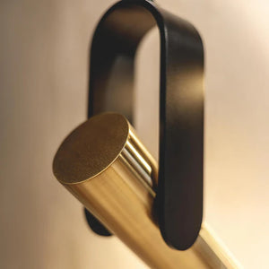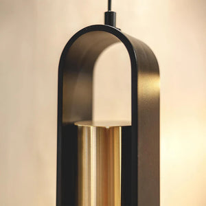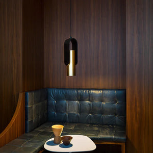 Description: The suspension sees an epoxy powder coated aluminum band structure accompanied by a cylindric weight that counterbalances its flexuosity, in a refined visual balance. The light source consists of a LED bulb; the cylinders are available in epoxy powder coated metal and in brushed brass.