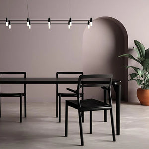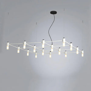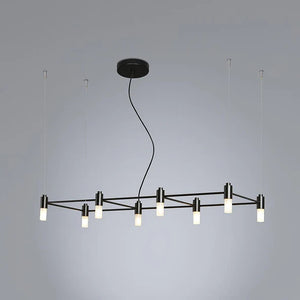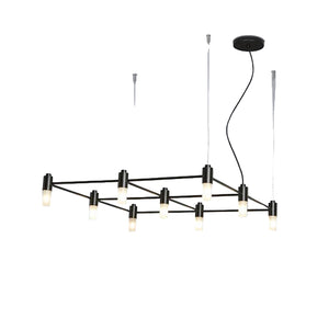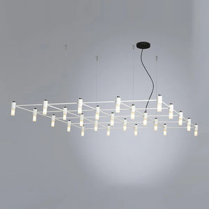 Its structured, geometric frame features candle-style pendants arranged in a linear rhythm, evoking a sense of order and balance while delivering tasteful and effective illumination. This bold composition creates a dramatic focal point—ideal for dining areas, statement stairwells, or upscale hospitality settings such as bars and lobbies.