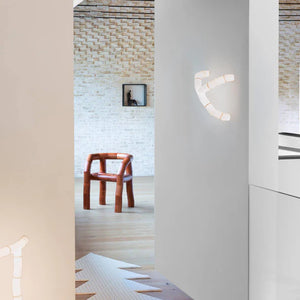 Description: Sculptural characters and deconstructed lights, for accessories that border on art: Tratti is a scenographic modular lighting system made up of floor lamps, ceiling lamps and wall sconces that stand as entities in which lighting and matter unify. Characterized by a slightly grainy white finish, noticeable even when turned off, and made of 3D printed nylon powder, these lamps are defined by a soft and diffused light that outlines the anatomical structure of the element from the inside.