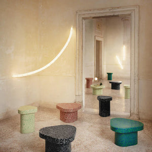 Description: Sculptural characters and deconstructed lights, for accessories that border on art: Tratti is a scenographic modular lighting system made up of floor lamps, ceiling lamps and wall sconces that stand as entities in which lighting and matter unify. Characterized by a slightly grainy white finish, noticeable even when turned off, and made of 3D printed nylon powder, these lamps are defined by a soft and diffused light that outlines the anatomical structure of the element from the inside.
